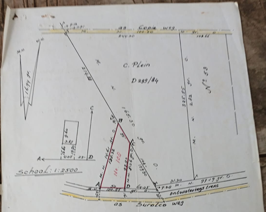 - Eigendom, Garnizoenspad, op de hoofdweg, gr. 1953 m2 (25x80m). Hoogte Upkarweg. Vraagprijs €135.000,=.