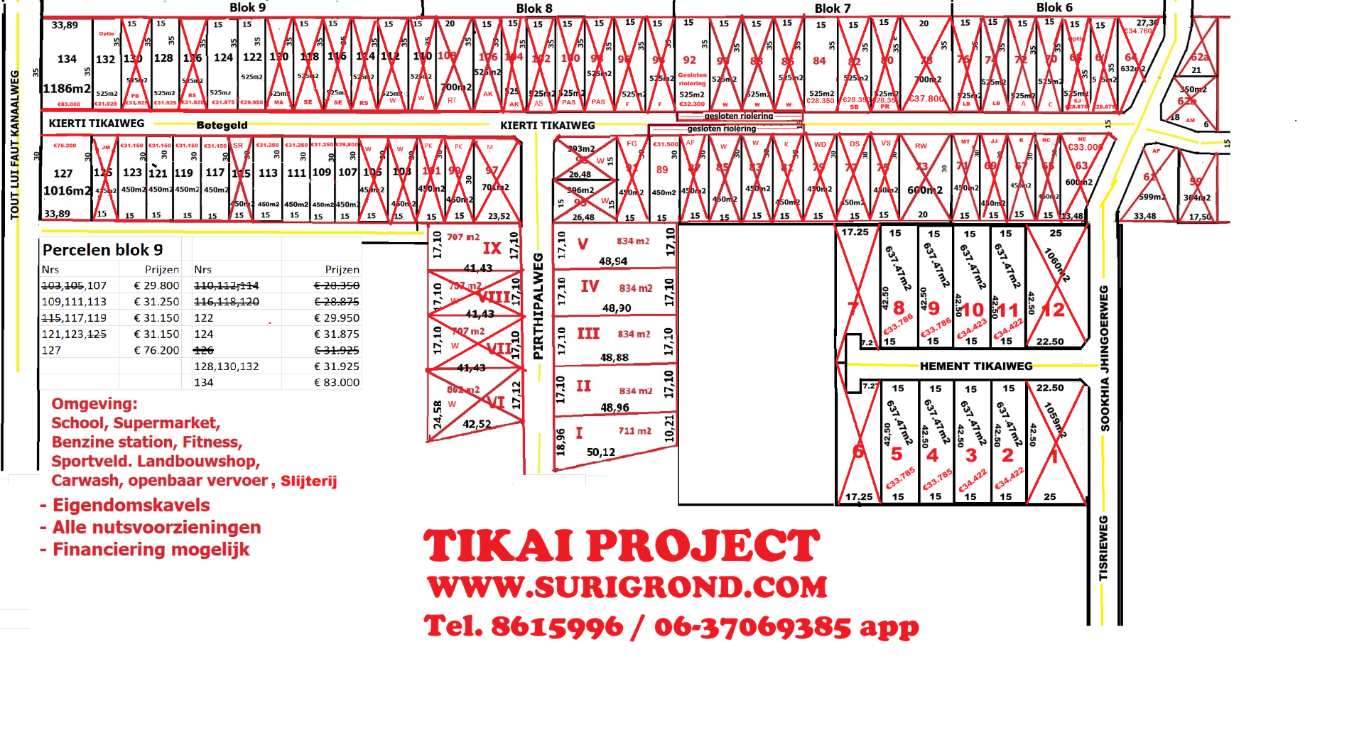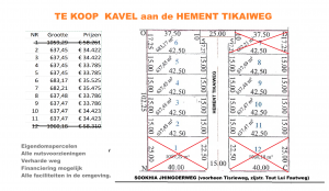- Eigendom, Tikaiproject aan de Hement Tikaiweg. Percelen zijn bereikbaar vanaf Tout Lui Fautweg – Tisriweg of vanaf Kierti Tikaiweg. Zeer goed gelegen te midden van School, Fitness-center, Winkels, Slijterij, Benzine stations, Carwash etc. De eigendomskavels zijn vanaf 637 m2 voor €33.785,-. Bel of whatapp op het bovenstaand nummer.
