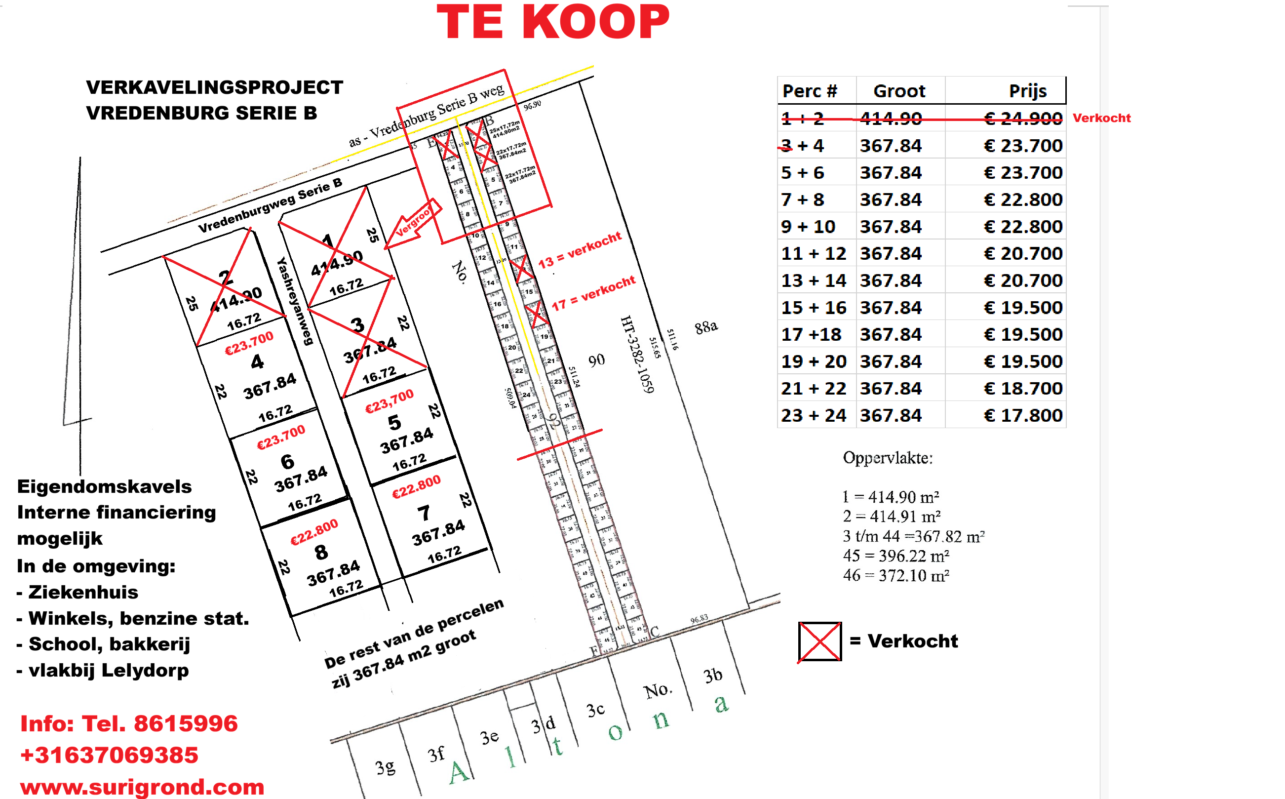 - Eigendomskavels. Vredenburg Serie B. Prachtige bouwklare kavels vanaf 378 m2 voor €17.800,=. Zie overzicht hieronder. Zeer goed gelegen dichtbij het Wanica ziekenhuis, winkels, Landbouwshop, benzine -station, lagere school, bakkerij, carwash, etc.
